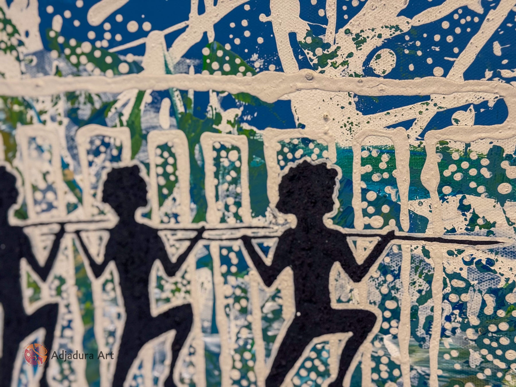 This artwork captures the Nharangga people dancing on the saltwater country of Guuranda (Yorke Peninsula), their movements intertwined with the land and sea. Figures in deep charcoal contrast against the coastal terrain, while white ochre symbols and patterns tell stories of kinship and connection. Swirling blues and whites reflect the rhythm of the tides, embodying the unity between people, culture, and Country.”