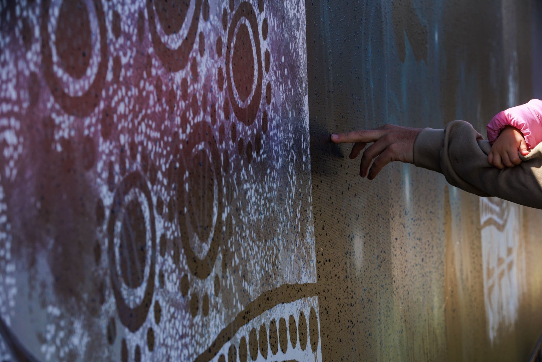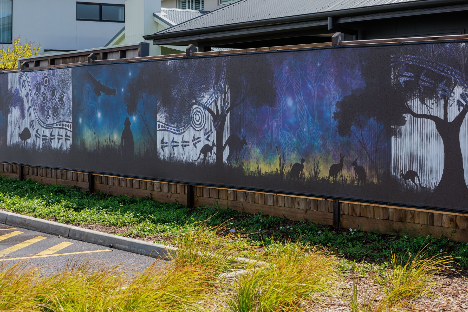 The mural weaves together cultural stories, longlines, and personal connections to place, representing both the natural environment and cultural identity of the area. It features Wollert — the possum in Woi Wurrung — alongside native flora and fauna, night skies, and a stylised Aurora Australis, paying tribute to the community’s deep ties with the local landscape.