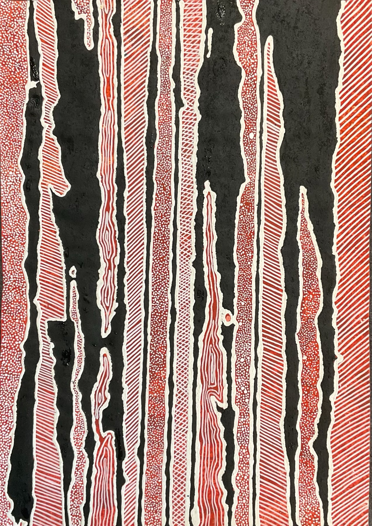 White lines and forms carry cultural and ceremonial meaning, holding space for practice, law, and continuity. Crossing lines reference nets, baskets, and mats made from grasses — technologies of survival and care that come directly from Country. These patterns sit alongside straight lines that represent grasses and plants that require fire to regenerate and be managed properly.